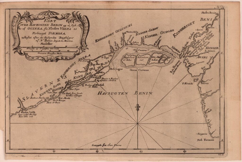 Map showing the Bight of Benin, including Popo and Whydah. Niels Hansen Møller, “Kort over Havbugten Benin og et stÿkke af Guinea” (1750). Courtesy of the John Carter Brown Library.